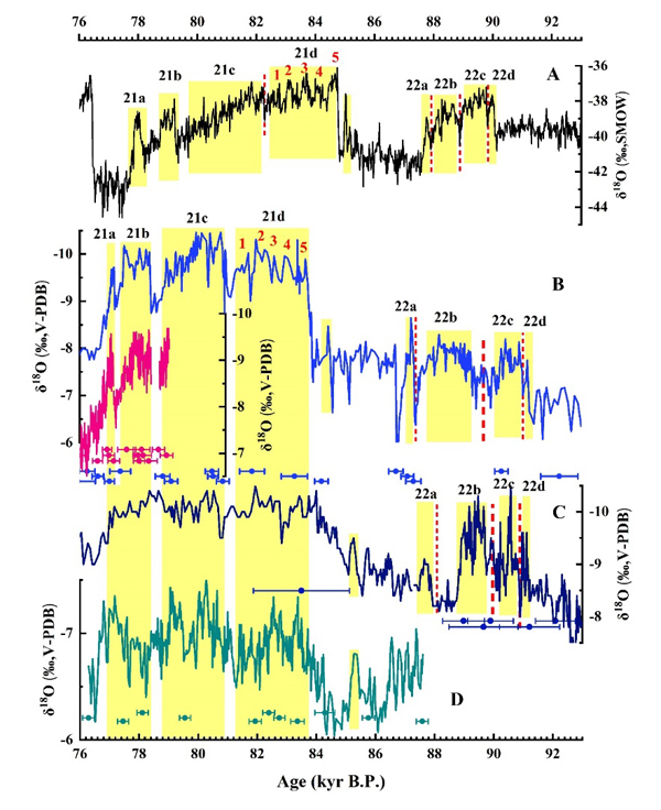 在国家重点研发计划专题项目(批准号:2016YFC050230205)和国家自然科学基金项目(41971109)的支持下,杨勋林副教授课题组在重庆金佛山喀斯特生态系统核心区域羊口洞和金佛洞进行了深入的勘察和长期的监测,获得了连续的数据和宝贵的石笋样品。杨勋林副教授课题组利用精确测年和高分辨率的氧同位素数据重建了过去98.8-59.3 kyr B.P. (thousands of years before 1950 CE) 以来亚洲夏季风演变历史。本研究重建了MIS 5/4转换时期亚洲夏季风的演变历史,着重分析了亚洲夏季风的5次中国间冰阶事件CIS18-22。研究发现: