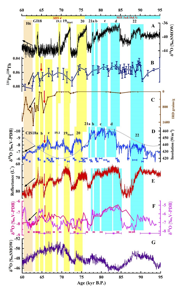 (2). 大西洋经向翻转环流(AMOC)和热带辐合带(ITCZ)是亚洲季风与格陵兰气候变化之间的纽带。 在MIS 5时期,北半球夏季太阳辐射值较高,AMOC得到加强,ITCZ的年平均位置向北移动,这促使亚洲季风区与北部高纬度地区之间的气候遥相关效应增强。 但是,AMOC的减弱,ITCZ的南移以及南极洲的影响增强,导致MIS 4时期亚洲夏季风与北部高纬度地区的气候存在不耦合现象。
