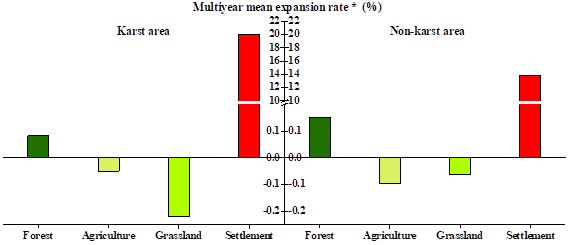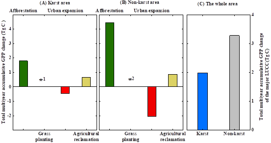 4 西南喀斯特和非喀斯特区域主要土地利用变化导致的多年累积GPP变化