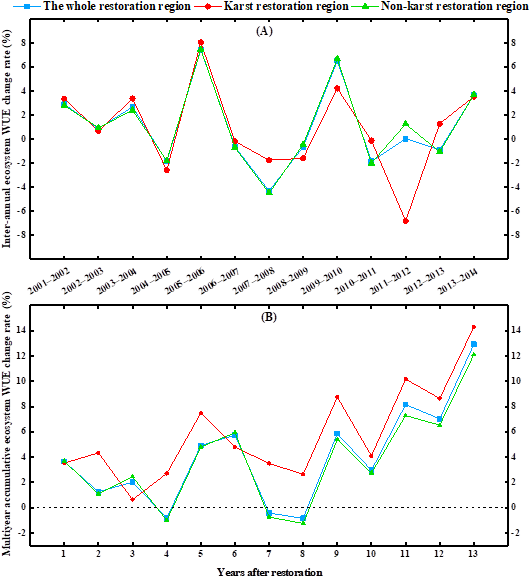 7 20012015 生态恢复措施区域生态系统水分利用效率年际变化率(A)和多年累积变化率(B
