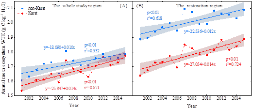 6 20012015西南全区域(A)和生态工程区域(B)喀斯特和非喀斯特的生态系统水分利用效率(WUE