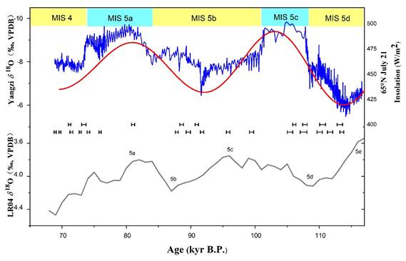 图1 YYZ1石笋δ18O时间序列(蓝色)与北纬65°7月21日太阳辐射量(红色)及大洋底栖有孔虫δ18O变化曲线(灰色,反映全球冰量多少)的对比图