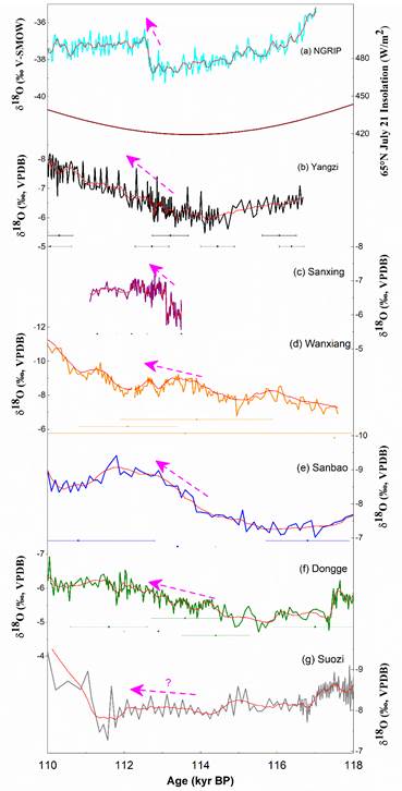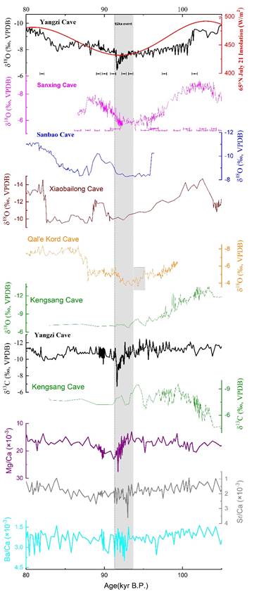 本研究样品YYZ1石笋采自重庆市丰都县羊子洞,基于高分辨率铀系定年、氧碳同位素及微量元素分析,重建研究区70-115 kyr B.P.亚洲夏季风(ASM)变化的高分辨率记录。研究发现:(1) YYZ1石笋δ18O记录支持海洋同位素阶段(MIS)5a和5c期间的ASM强和MIS 4、5b和5d期间ASM弱的结论(图1)。(2) 据YYZ1石笋样品的多指标记录的结果,发现在93.0至91.5 kyr B.P.之间有一次名显的干旱事件,称为“92 kyr事件”,该事件表现为突然的、快速的呈“V”形波动的变化特征(图2)。(3) 研究发现D-O 25事件在本研究和其他中国洞穴记录中并不明显(图3)。D-O 25事件发生在北半球夏季日照(NHSI)减少的一段时间内,这导致了不同的气候变化背景,如冰量增加和北大西洋相应减弱的温盐循环(THC)。(4) 记录发现高NHSI期或暖期内的D-O事件(MIS5a,MIS5c)的波动比低NHSI阶段或冷期内(MIS5b、MIS5d)的波动更明显。因此,认为石笋记录D-O事件之间的差异主要与ASM的变化强度有关,根本机制是对NHSI变化的响应。此外,D-O事件期间的ASM演化也受到南半球和低纬度地区气候变化的影响,这一点不容忽视。