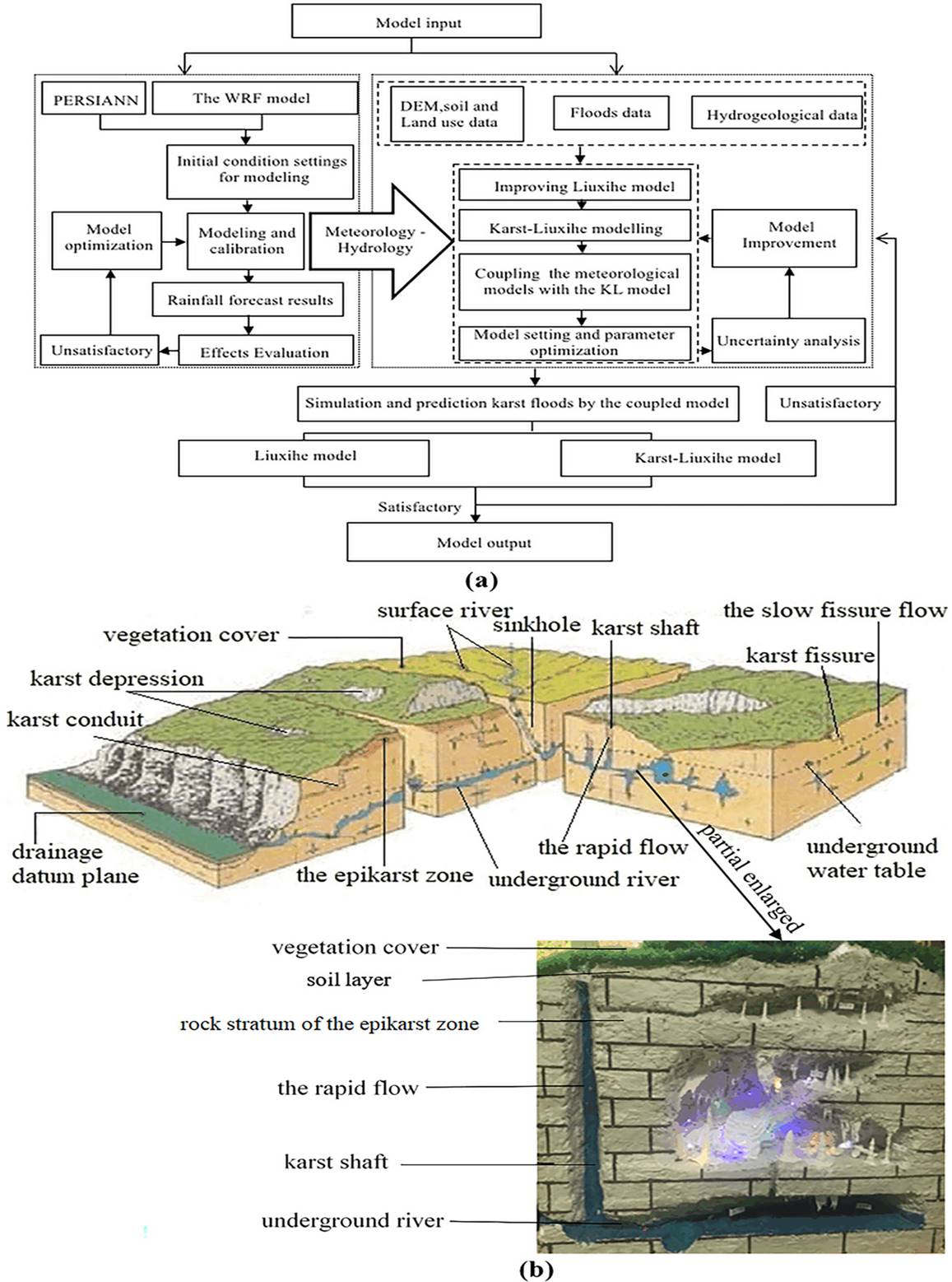 通常部分裸露型岩溶地区由于地表透水性差,降雨入渗小,容易形成地表快速径流而造成内涝灾害。 水文模型可以为岩溶地区的洪水预报提供关键的技术支持。 但由于岩溶地区水文地质条件复杂,且岩溶含水介质各向异性,使得水文模拟远比非岩溶地区困难。 发表于Journal of Hydrometeorology的这篇文章通过引入岩溶水文循环机制,对陆地分布式水文模型—流溪河模型进行了改进,建立喀斯特—流溪河模型。 基于该模型的岩溶洪水过程模拟效果明显优于原始流溪河模型,表明模型结构和算法的改进是有效和必要的。 然后将改进后的喀斯特—流溪河模型与修正后的WRF模式与PERSIANN卫星测雨模型进行耦合,广西柳江岩溶流域洪水良好的模拟结果表明,该气象水文耦合模型可以有效地应用于大型岩溶流域的洪水模拟预报研究。