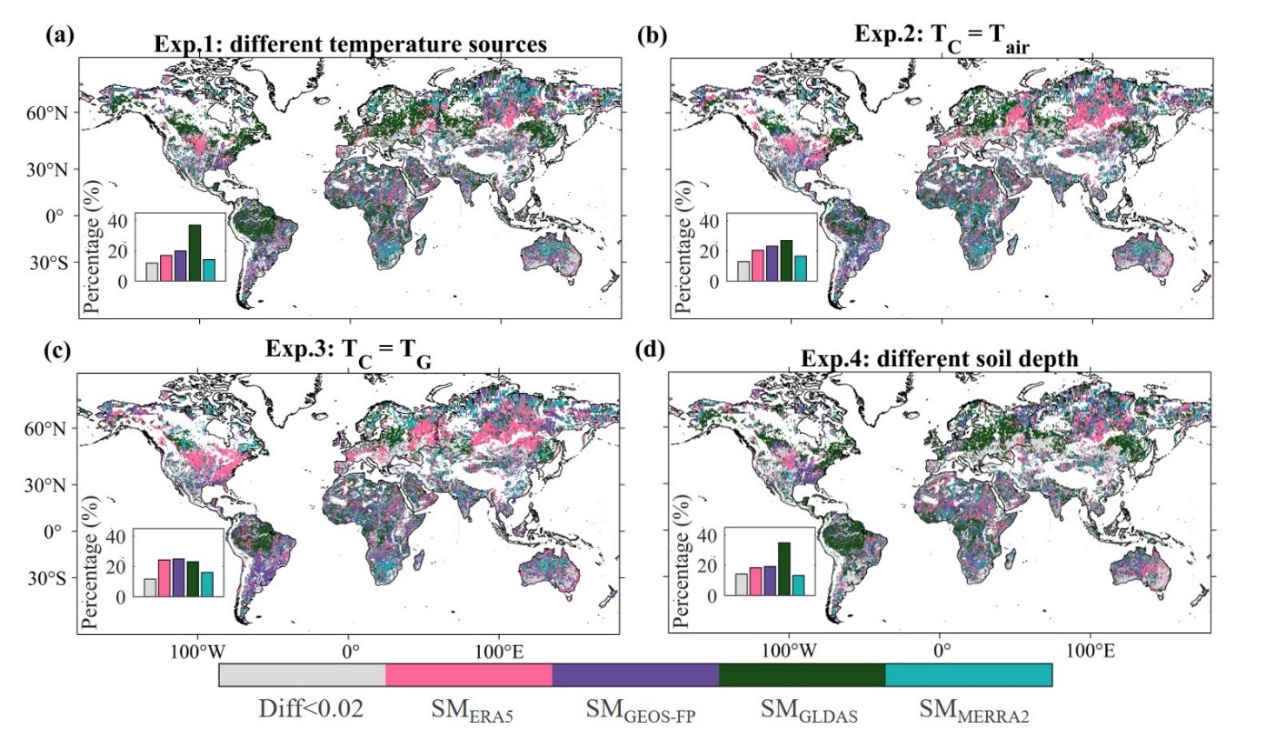 樊磊教授团队近日在国际遥感领域TOP期刊Remote Sensing of Environment(IF=13.5)上发表优化温度效应的全球土壤水分与VOD微波反演算法改进的最新成果。在环境监测和农业管理中,土壤水分(SM)和植被光学厚度(L-VOD)是重要的参数。通过τ-ω模型反演的SM和L-VOD产品的精度高度依赖于基于模型温度的有效温度输入。研究针对当前低频被动微波反演SM与VOD时,未充分考虑温度效应,导致反演精度低的问题,提出基于优化温度效应的微波反演算法,精度显著优于同类算法,其中在全球18%的地区提升了土壤水分和植被光学厚度反演精度。研究表明使用GLDAS温度产品输入的SM反演结果具有最佳性能,尤其是在森林区域(图1)。对不同温度输入对反演结果影响显示,利用浅层土壤温度获得的土壤有效温度比深层土壤温度反演的SM结果更准确。由此,作者提出利用GLDAS表皮温度和第1层(0-10 cm)和第2层(10-40 cm)的土壤温度来估算有效温度。改进后的有效温度输入反演的SM结果相较于原始SMAP-IB的总体TCA-R中值(0.76),提高到0.78,尤其是对森林覆盖区域提升显著。基于改进后有效温度反演的L-VOD结果相较于原始SMAP-IB的L-VOD结果也有较好的提升,并且基于GLDAS温度输入的L-VOD产品在不同温度情景下都优于原始SMAP-IB的L-VOD结果(图2)。