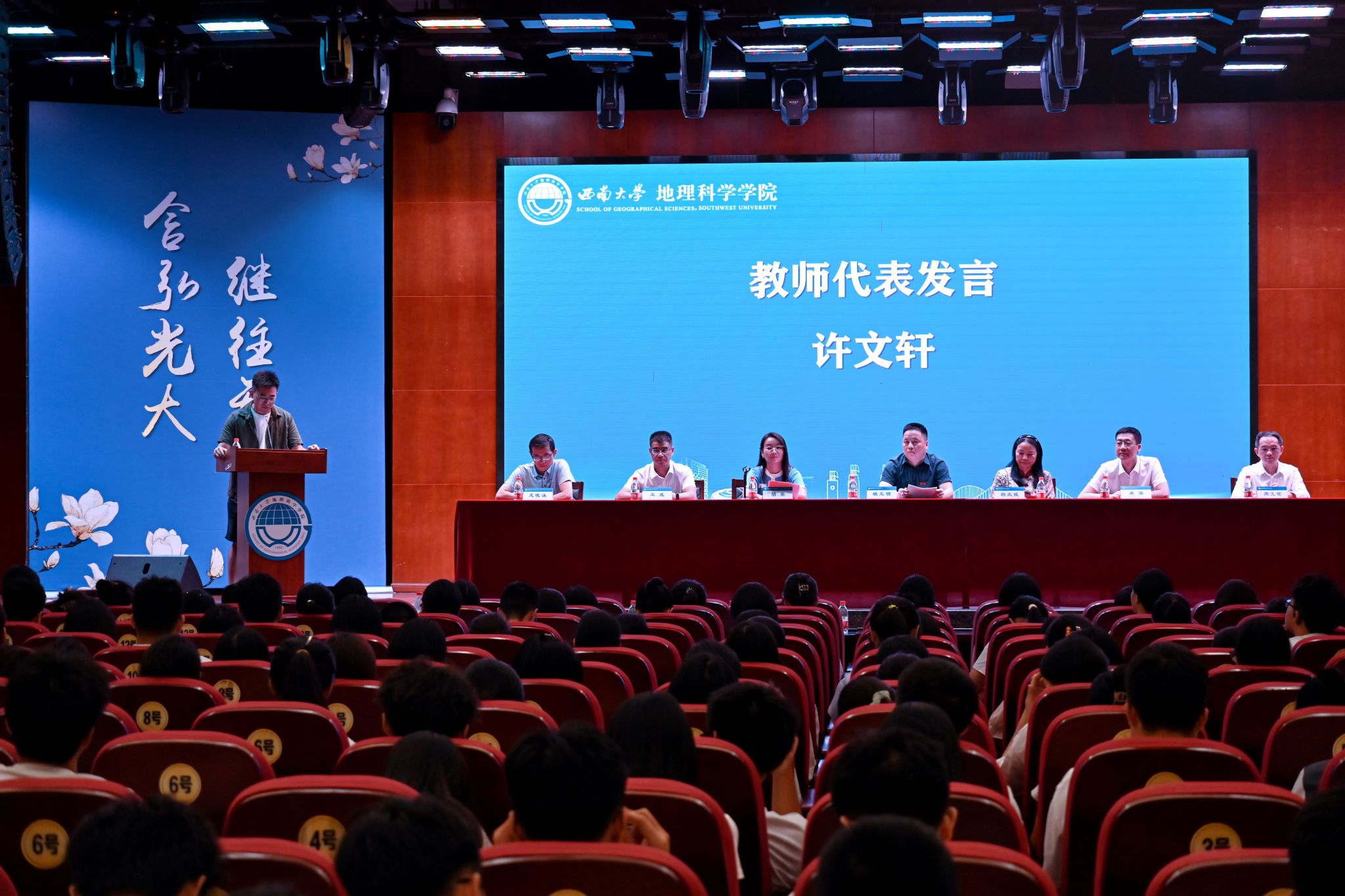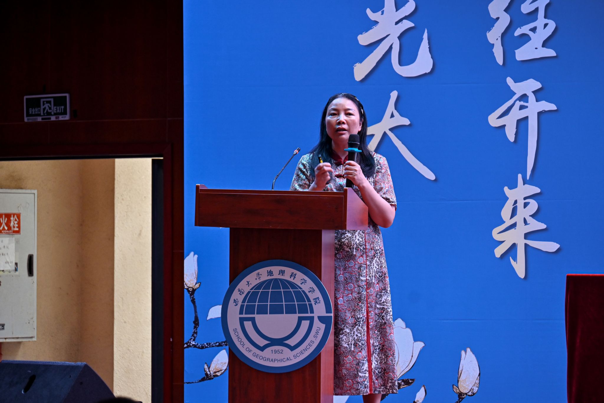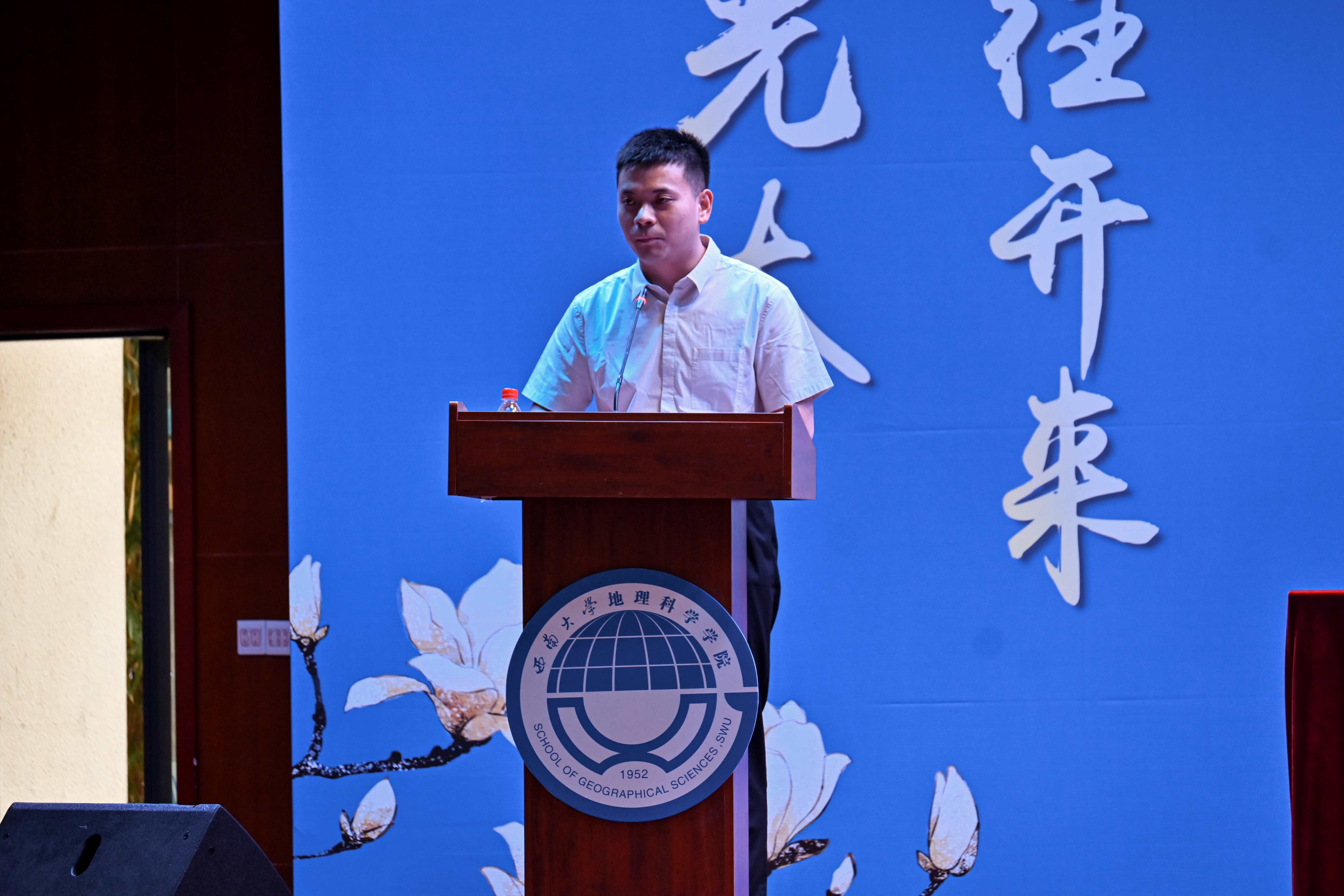 2024级地理科学(师范)专业本科生陈睿彤作为新生代表发言,她表达了自己对老员工活的期待和对地理科学专业的热爱,号召同学们勇敢追逐梦想,勤勉学习。2021级地理信息科学本科生范美怡和2022级地图学与地理信息系统专业硕士研究生常智健分别作为本科生与研究生的老生代表发言。范美怡向学弟学妹们表示欢迎和祝福,激励大家珍惜时间、不断尝试,在科研道路上探索求知;常智健则告诫新生们要学思想、学方法、学态度,珍惜“滚烫的青春”,做自己的“天命人”。