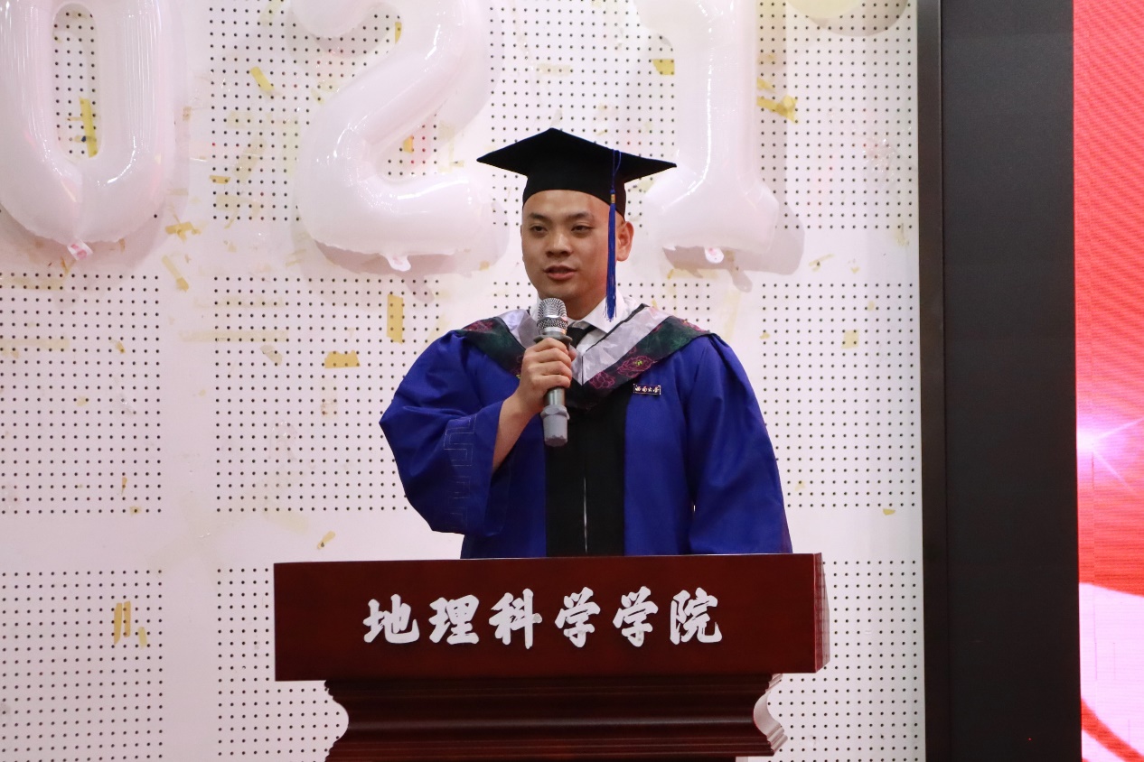 2021级地理信息科学专业黄诚作为本科毕业生代表发言,她以“脚步唯实,共撷研趣”回顾四年时光,讲述了学习科研中的奋斗与热爱、孤独与坚持、无憾与成长,呼吁同窗“在人生‘路径分析’中寻得通向理想的最优解”。2022级地图学与地理信息系统专业常智健作为毕业研究生代表发言,他强调“信念”“坚持”“担当”,表示在未来的征程中将扎根基层,以青春之名赴时代之约。