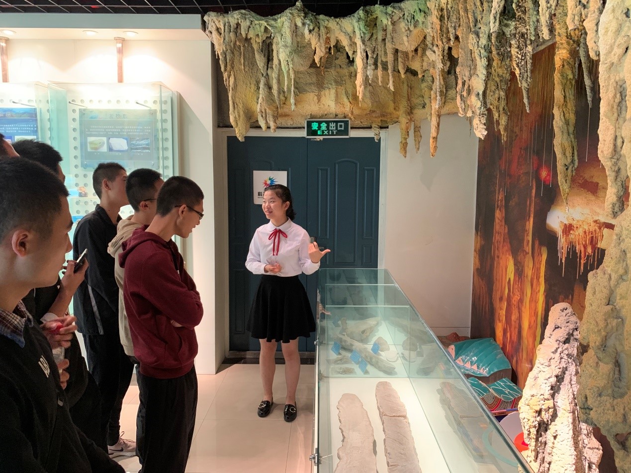 随后,师生们一同来到地质馆。看到眼前各式各样的岩石、化石,大家兴致勃发。在讲解员的引导下,师生们不仅大开眼界,而且对地质岩石、地质时代等知识有了更为深入的了解。