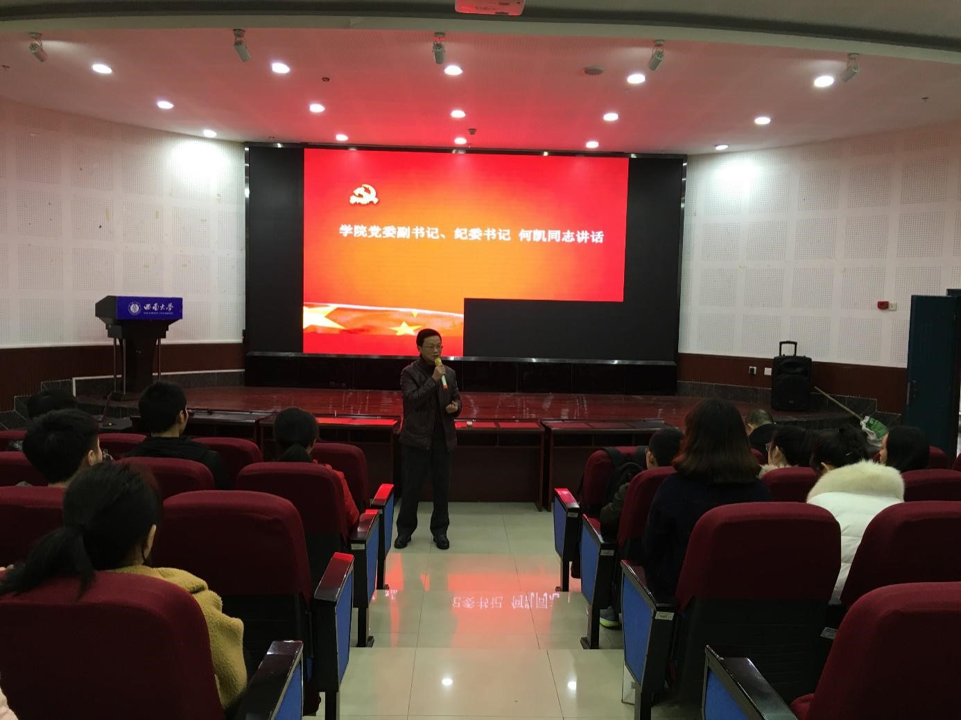 宣誓完成后由党委副书记何凯同志发言致辞。何凯同志谈及守岛英雄王继才,呼吁全体党员同志要学习王继才的爱国奉献精神,引导广大师生立足本职岗位,弘扬奋斗精神,愿员工党员们以今天的奋斗成就更加美好的明天。