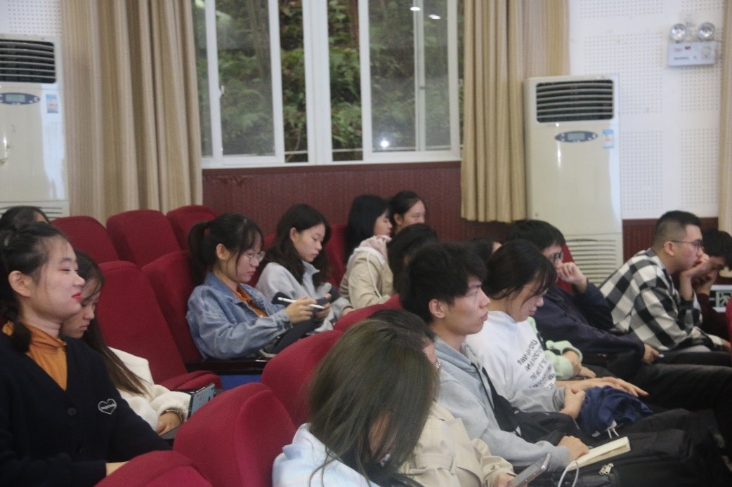 实习总结汇报结束后,2018级实习生代表饶剑彪进行了实习成果演示。他在会场打造了一堂微课,用南海海域与临海关系的例子引出海洋权益的课程主题,引用历史故事解释地理词汇的具体含义,营造了幽默风趣的课堂氛围,赢得了现场同学们的热烈掌声。