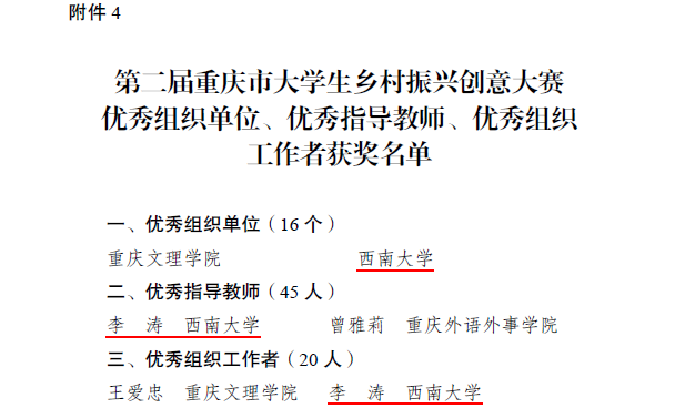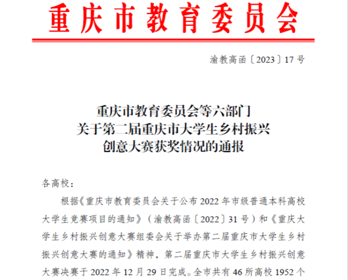根据《重庆市教育委员会等六部门关于第二届重庆市老员工乡村振兴创意大赛获奖情况的通报》(渝教高函〔2023〕17号),bevitor伟德师生在第二届重庆市老员工乡村振兴创意大赛中再创佳绩,荣获特等奖2项、二等奖1项、三等奖1项。公司新文科实验室副主任李涛老师获“优秀指导教师”和“优秀组织工作者”荣誉称号。