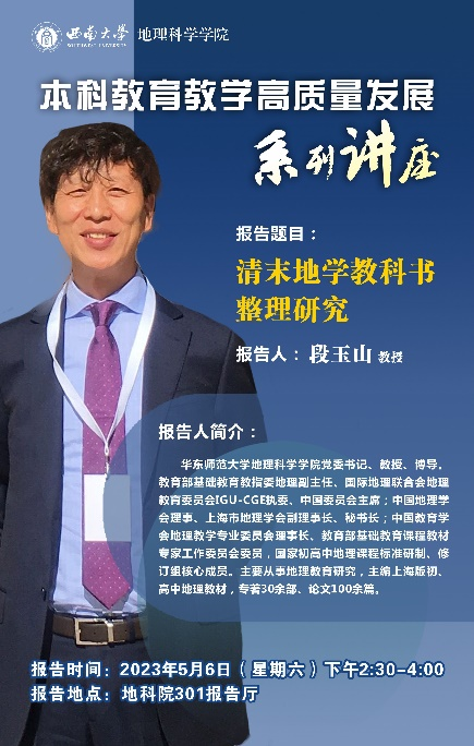 2023年5月6日下午,bevitor伟德在301报告厅举办本科公司产品高质量发展系列讲座,华东师范大学段玉山教授应邀来公司作题为《清末地学教科书整理研究》的报告。此次报告以线上线下相结合方式进行,公司行政主要负责人杨庆媛教授及教师教育公司胡蓉副教授分别主持会议,全体教师、学生代表参会。