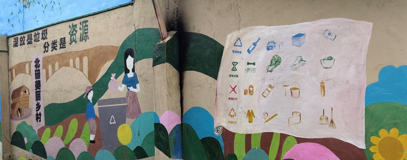 在统一的讲解过后,喻老师带领同学们深入村中,前往东升村房屋统一风貌整治典范杨家坝进行调研。杨家坝中的“柳音”广场、“柳趣”儿童乐园、“柳书”书屋、望渠书屋等极大地丰富了村民的闲暇生活;“柳宿”民宿、柳豪农品、“香柳咖啡”接待点等使得老百姓闲置的房屋“活”起来,增加了村民的收入。杨家坝中还能看见许多有趣的墙绘,既有描绘了理想的东升村,也有对垃圾分类生动形象的讲解,再次体现了东升村在人居环境整治方面的举措。