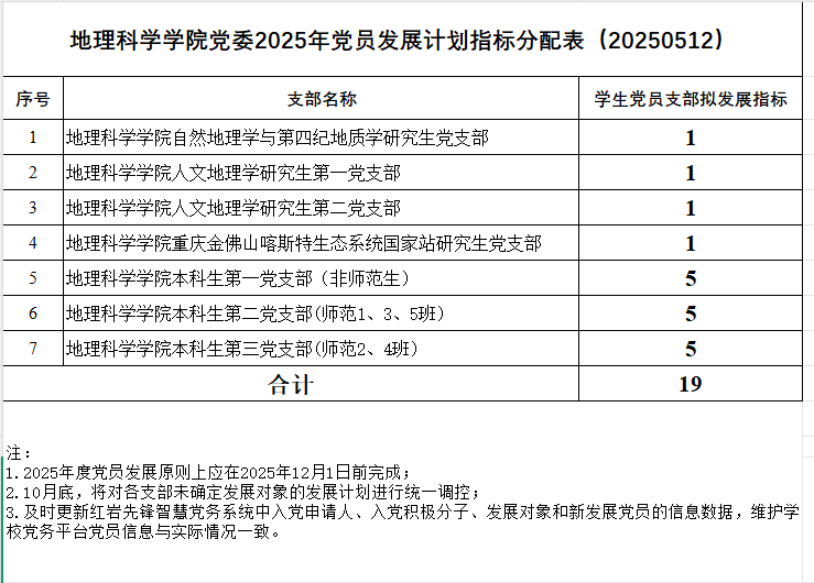 公司党委2025年党员发展计划指标分配表